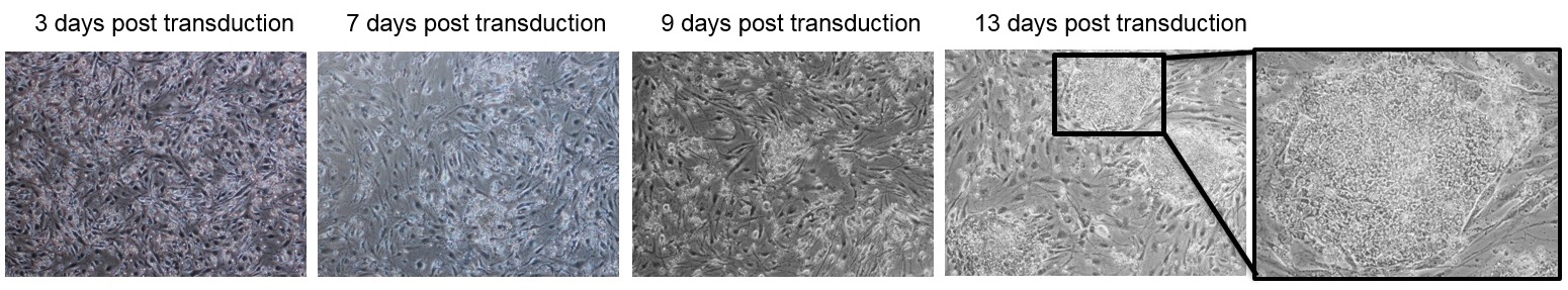 Generation of iPSCs from PBMC by reprogramming with Sendai virus vectors (CytoTune™, Invitrogen). Pictures show the development of stem cell colonies from PBMC transduced with the viral vectors encoding the reprogramming factors, Oct-4, Sox2, Klf4 and cMyc. Colonies at 13-15 days post-transduction are then selected for culture and the generation of an iPSC-line.