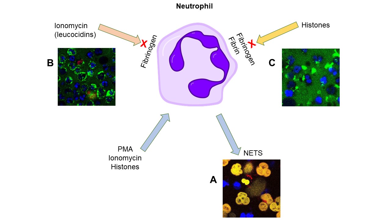 NETs are mixtures of DNA, histones and enzymes expelled by dying neutrophils as part of an ancient immune defence mechanism to fight invading pathogens. In vitro NETosis can be triggered by PMA or calcium ionophores, like ionomycin. Histones are highly charged cytotoxic proteins and we find they also trigger NETosis [9]. There is a risk of positive feedback where NET formation and histone release could cause widespread collateral damage. However, fibrinogen reduces NET generation and histone cytotoxicity [9].