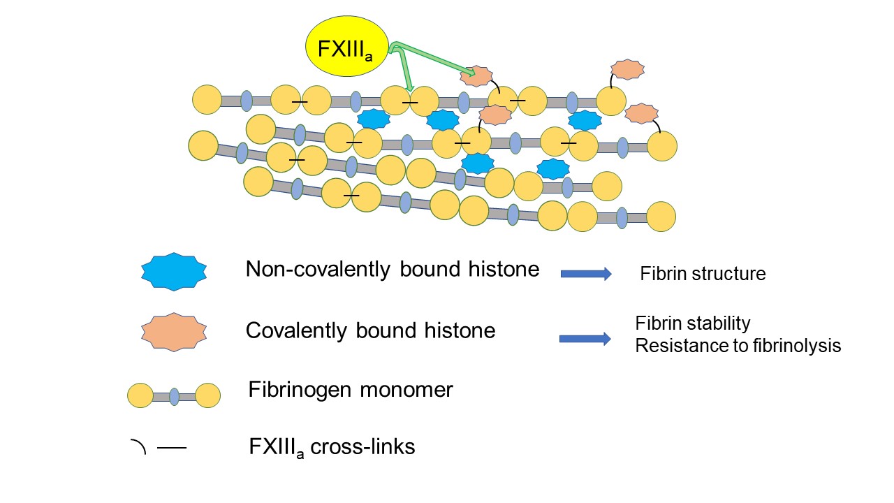 Histones are also known to interact with fibrin and affect structure and properties [10]. Recently we have found that histones can be cross-linked into fibrin by FXIIIa [11]. This covalently bound histone affects fibrin stability and fibrinolysis in a different way to histones that are associated with fibrin but not cross-linked [11].